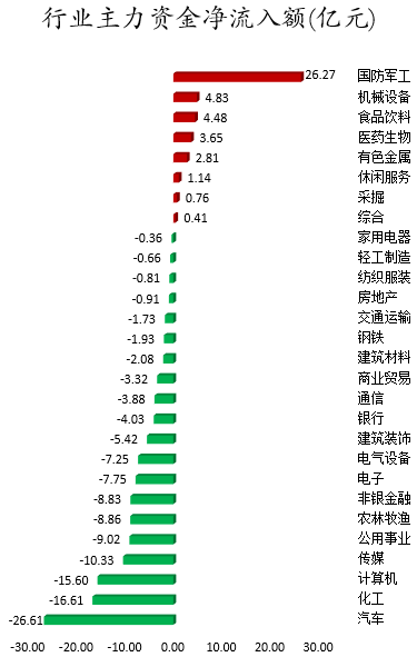 从行业板块来看,申万所属的28个一级行业,今日有8个行业板块主力资金呈现净流入,其中,国防军工行业板块主力资金净流入最多,净流入金额为26.27亿元;行业板块主力资金净流入居前的还有机械设备、食品饮料、医药生物,净流入金额分别为4.83亿元、4.48亿元、3.65亿元。20个行业板块主力资金呈现净流出,其中,汽车行业板块主力资金净流出最多,净流出金额为26.61亿元;行业板块主力资金净流出靠前的还有化工、计算机、传媒、公用事业、农林牧渔,净流出金额分别为16.61亿元、15.6亿元、10.33亿元、9.02亿元、8.86亿元。