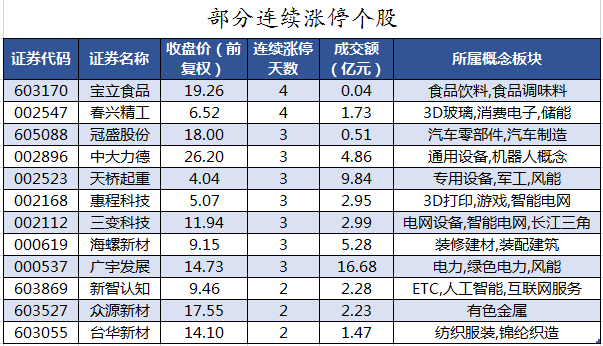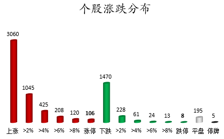 截至收盘,沪深两市合计3060只个股上涨,1470只个股下跌,平盘个股195只,停牌的个股5只。不含当日上市新股,共有106只个股涨停,8只个股跌停。连续涨停天数看,*ST亚联、*ST必康、春兴精工、*ST天成、宝立食品等均已连收4个涨停板,连续涨停板数量最多。