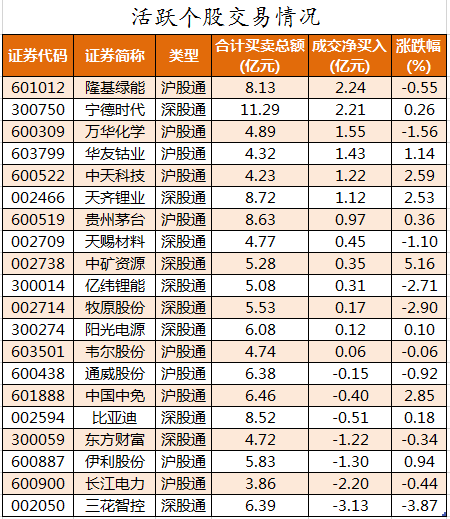 活跃个股方面,北向资金净买入较多的有隆基绿能、宁德时代、万华化学、华友钴业、中天科技,净买入金额分别为2.24亿元、2.21亿元、1.55亿元、1.43亿元、1.22亿元。北向资金净卖出较多的有三花智控、长江电力、伊利股份、东方财富、比亚迪,净卖出金额分别为3.13亿元、2.2亿元、1.3亿元、1.22亿元、0.51亿元。