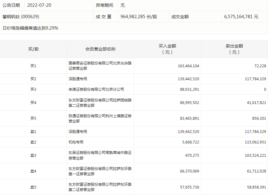 攀钢钒钛今天涨停。盘后数据显示,1个机构出现在龙虎榜单上,净卖出1.09亿元;国泰君安证券股份有限公司北京光华路证券营业部买入1.63亿元,同时卖出7.22万元;东吴证券股份有限公司常熟商城中路证券营业部买入47.03万元,同时卖出1.04亿元。