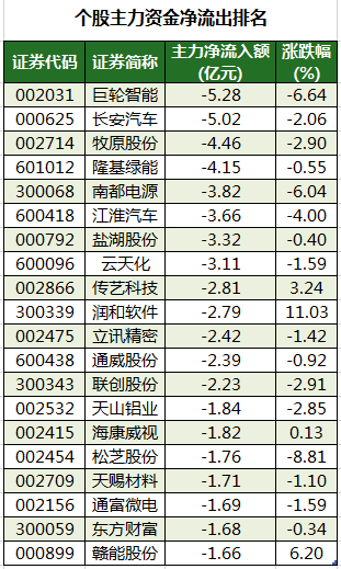 此外,2791只个股被主力资金净卖出,其中,42股被主力资金净卖出超1亿元。主力资金净流出最多的个股是巨轮智能,净流出金额为5.28亿元;主力资金净流出居前的个股还有长安汽车、牧原股份、隆基绿能、南都电源、江淮汽车,净流出金额分别为5.02亿元、4.46亿元、4.15亿元、3.82亿元、3.66亿元。