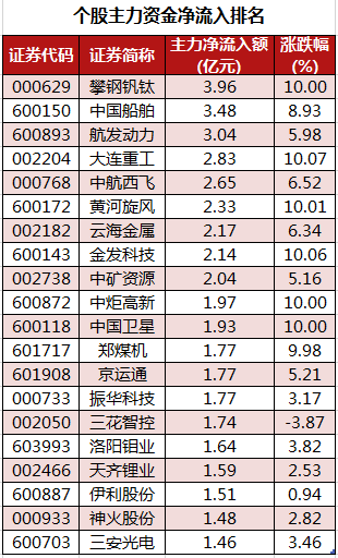 个股来看,今日有1924只个股获主力资金净流入,其中,44股获主力资金净流入超1亿元。攀钢钒钛获主力资金净流入最多,净流入金额为3.96亿元;主力资金净流入居前的个股还有中国船舶、航发动力、大连重工、中航西飞、黄河旋风,净流入金额分别为3.48亿元、3.04亿元、2.83亿元、2.65亿元、2.33亿元。