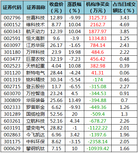 盘后龙虎榜数据显示,今日机构席位资金合计净卖出约8032.22万元。其中,净买入的个股9只,净卖出的个股11只。机构净买入最多的股票是世嘉科技,净买入金额约3125.73万元;机构净买入居前的还有维科技术、航天动力等股。机构净卖出最多的股票是攀钢钒钛,净卖出金额约1.09亿元。机构净卖出靠前的还有中科环保、今飞凯达、望变电气等股。