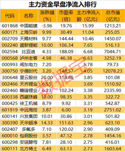 个股方面来看,共有78股获主力资金净流入1亿元以上,超过10亿元的仅3只,包括中国能建、上海贝岭、天赐材料。中国能建早间开盘涨停后跳水,收盘下跌3.96%,同时获得主力资金净流入15.99亿元。估值方面来看,早盘主力净流入股中中远海控、永泰能源、徐工机械最新滚动市盈率较低,均不超过10倍,中远海控最新滚动市盈率仅为6倍。
