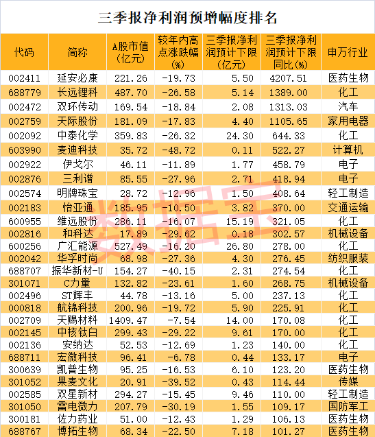 按照净利润预增下限计算,有28股净利润预计翻倍增长,其中延安必康、长远锂科、双环传动、天际股份等4股预增10倍以上,这4股均与新能源题材相关。延安必康净利润预增42倍至46倍,预增幅度暂居第一位。从估值水平来看,截至9月27日收盘,博拓生物、ST辉丰、凯普生物、维远股份、中泰化学等5股市盈率均不到20倍。