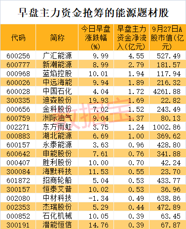 从资金流向来看,今日早盘上述三个题材股合计获得主力资金净流入28.33亿元。广汇能源、新潮能源、蓝焰控股、中远海能、中国石化等股净流入均逾亿元。