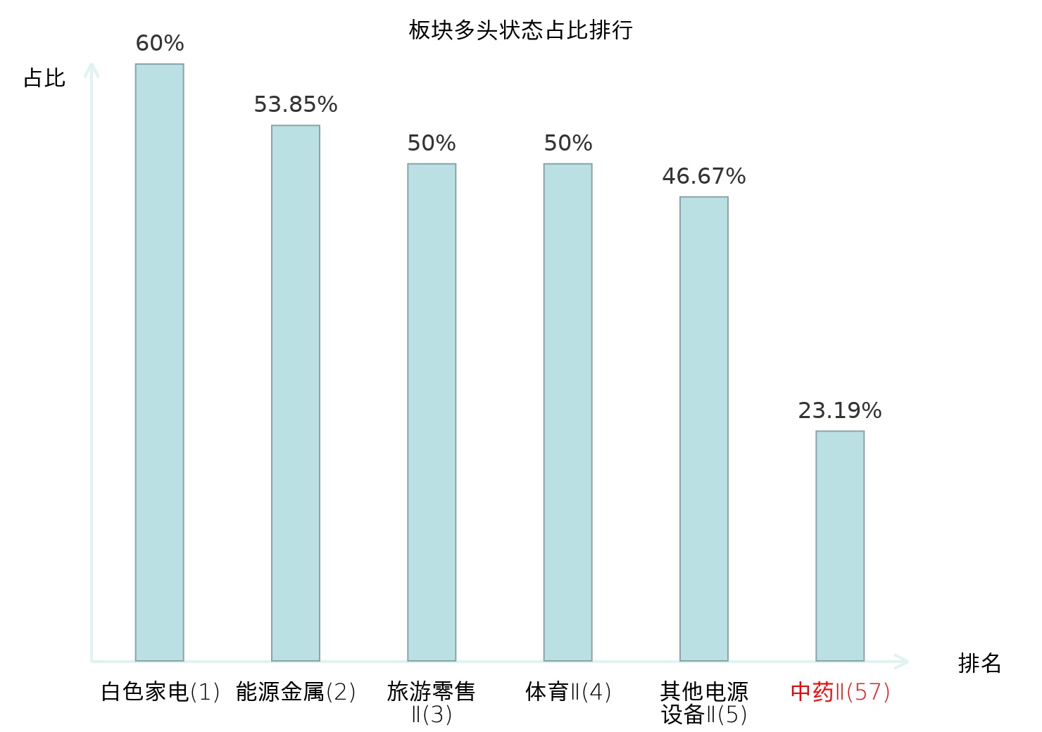 全市场所有行业板块中主力多头状态占比排名中,白色家电板块位居第一。体育Ⅱ板块名次提升最快,较昨日上升127位。