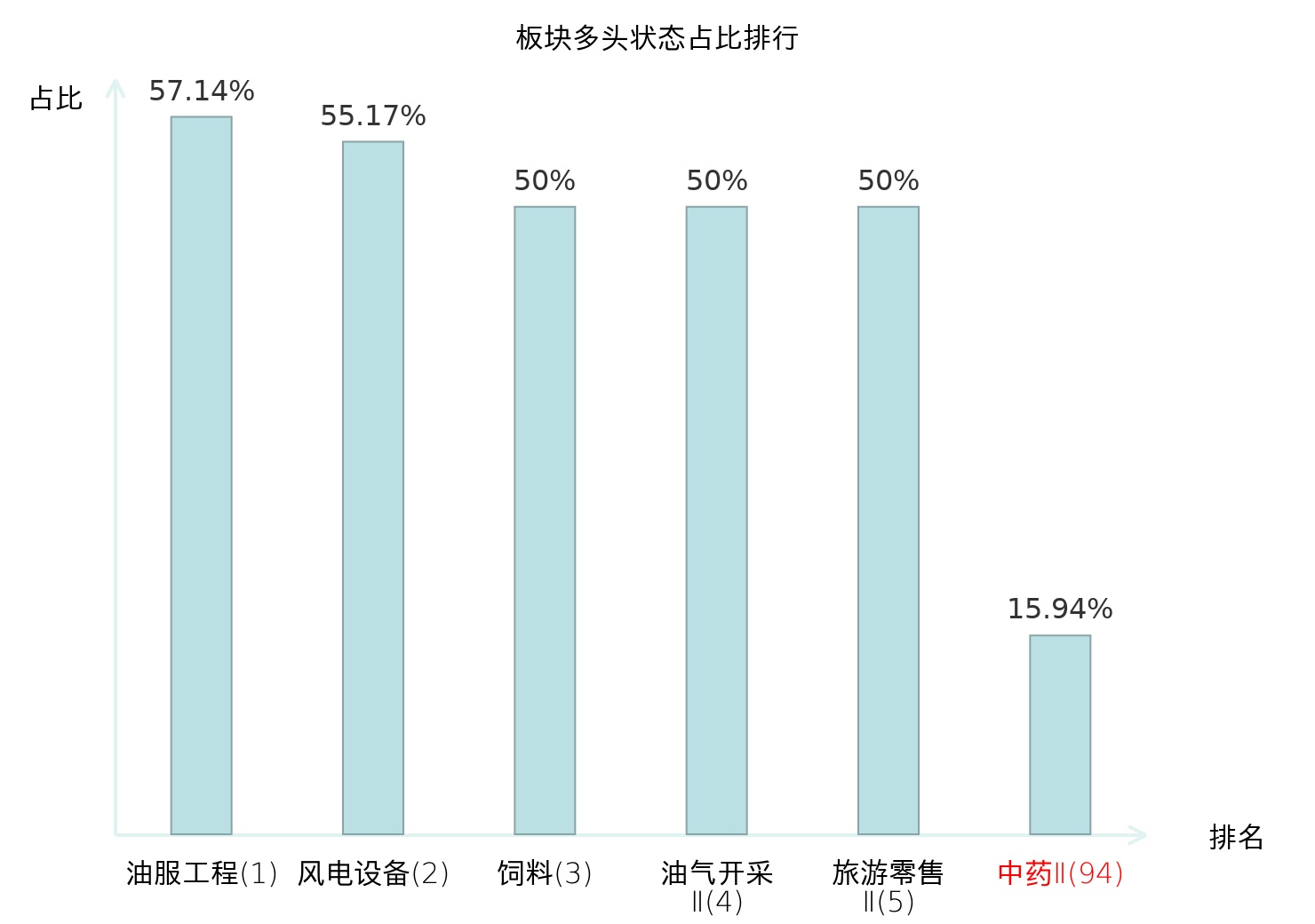 全市场所有行业板块中主力多头状态占比排名中,油服工程板块位居第一。非金属材料Ⅱ板块名次提升最快,较昨日上升67位。