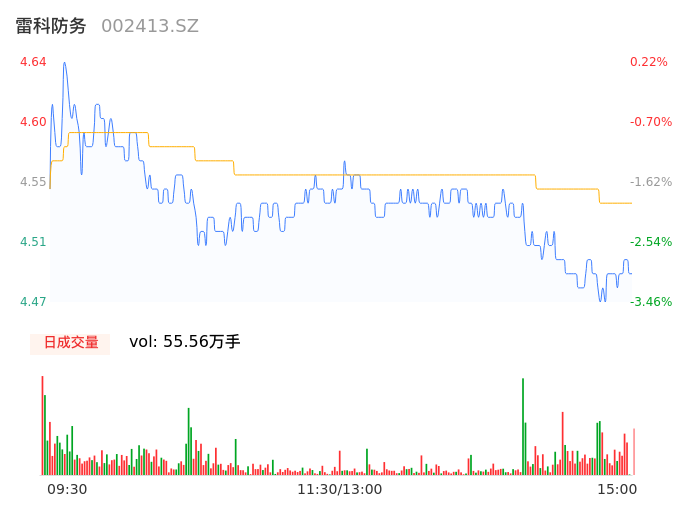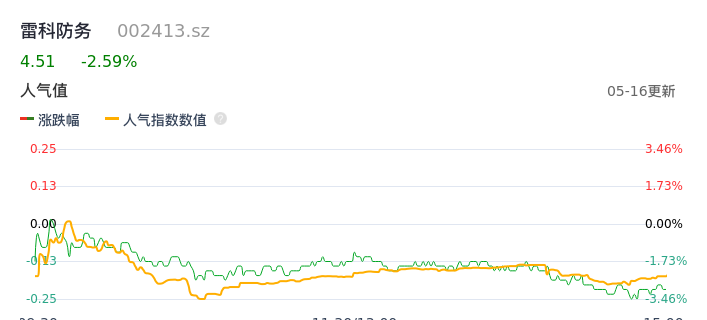 05月16日,雷科防务收报4.51,股价涨幅-2.59%,成交金额2.52亿元,换手率4.44%。