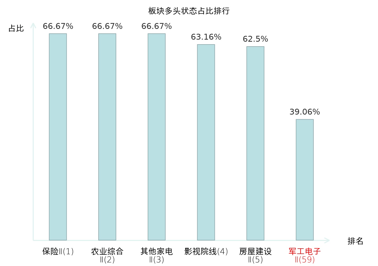 全市场所有行业板块中主力多头状态占比排名中,保险Ⅱ板块位居第一。渔业板块名次提升最快,较昨日上升103位。