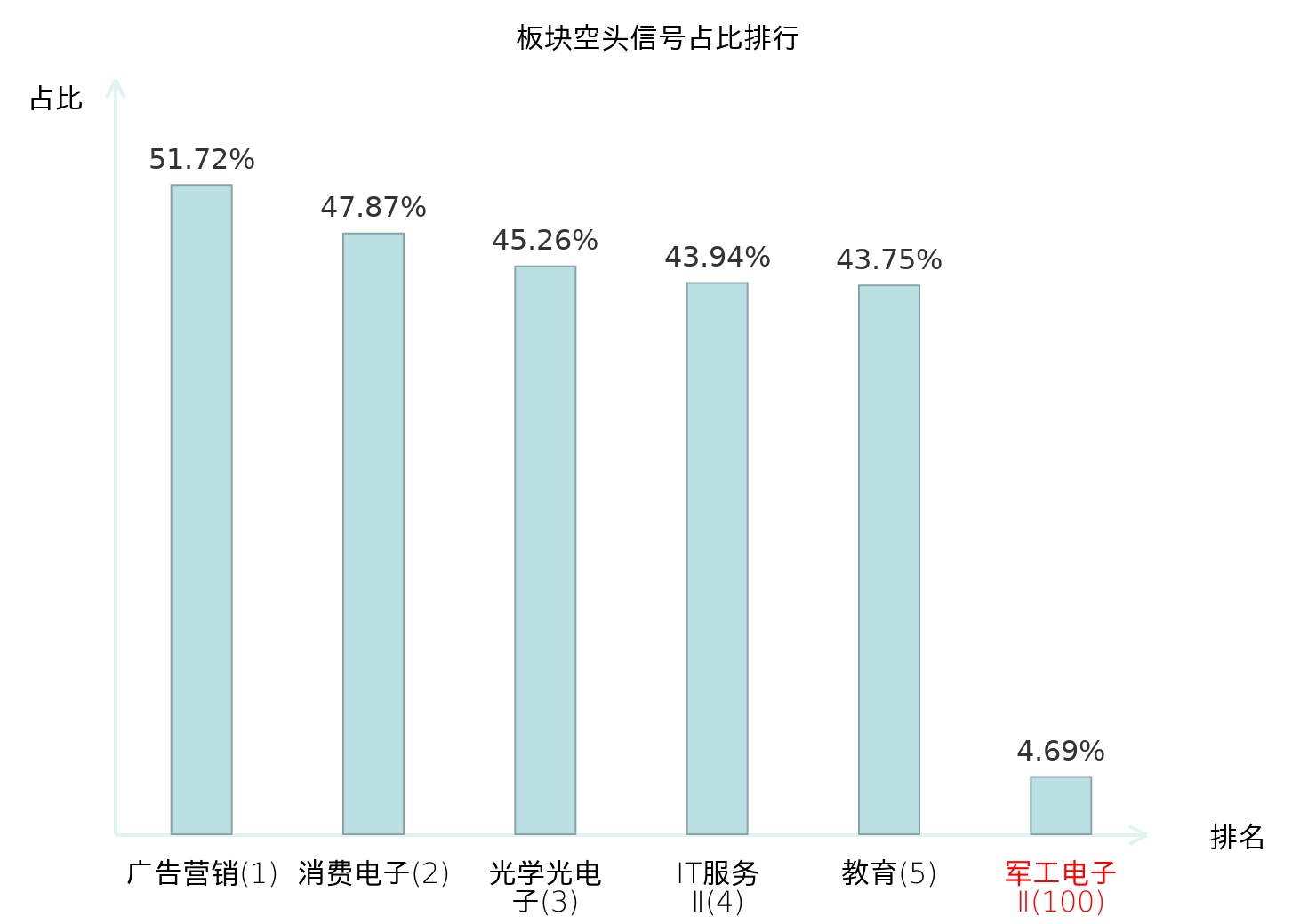 全市场所有行业板块中主力空头信号占比排名中,广告营销板块位居第一。广告营销板块名次提升最快,较昨日上升115位。