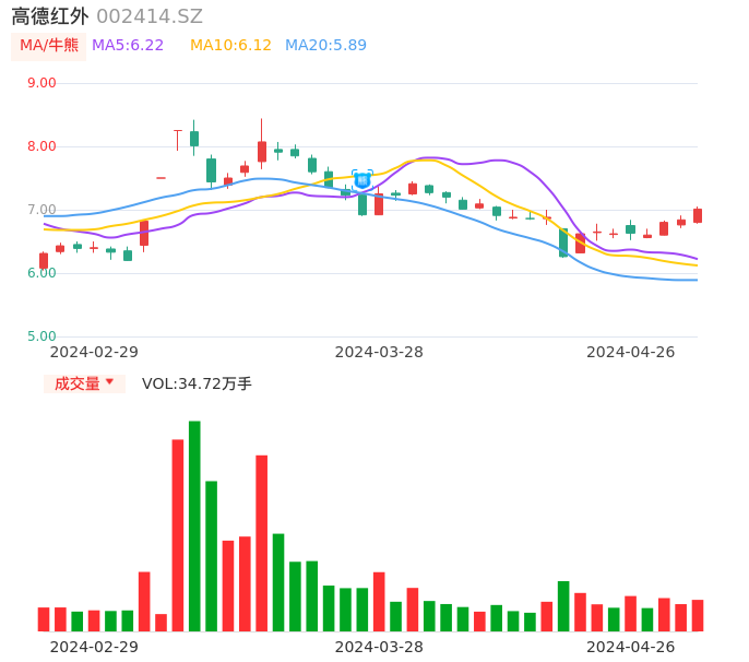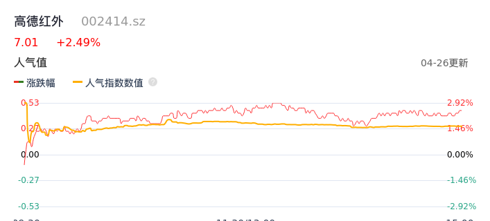 04月26日,高德红外收报7.01,股价涨幅2.49%,成交金额2.42亿元,换手率1.02%。