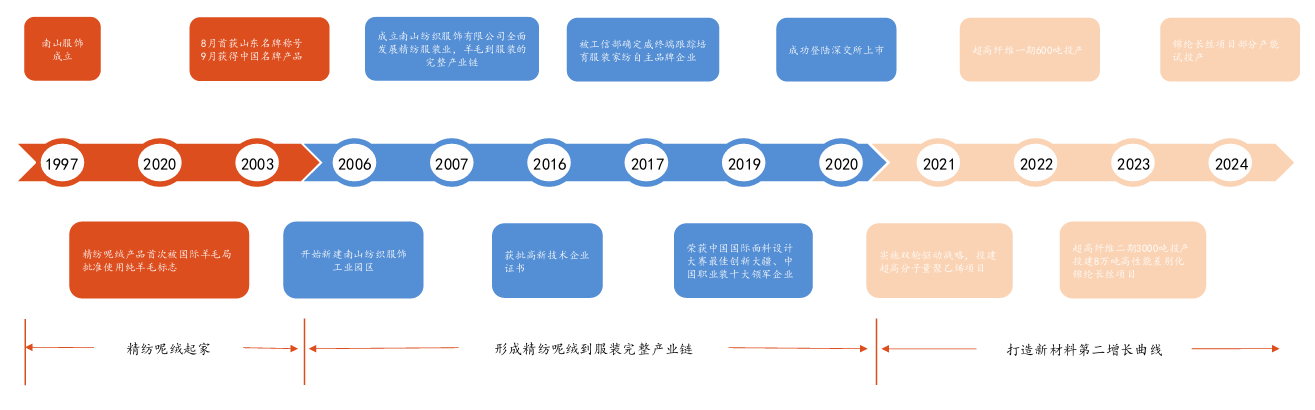 国内毛纺一体化龙头,精纺服装+新材料双轮驱动。精纺服装:公司传统业务实现“面料+服装”全产业链一体化布局,已形成1600万米精纺呢绒和75万套西装成衣产能,其中精纺面料经过公司二十余载深耕,已发展为国内纺织服装行业精纺细分领域的领军品牌,构建了商务、时尚、户外等多维领域的中高端产品矩阵,为国际众多奢侈品牌提供高端面料。服装产品拥有职业装团购、高级定制、OD/OEM等业务板块,为国内公检法司、金融、轨交、能源电力等系统职业装头部供应商。新材料:新材料领域,公司以超高分子量聚乙烯作为转型升级的核心突破口,年产能合计达3600吨,可生产100D-2400D、26cN/dtex-42cN/dtex等不同规格产品,广泛应用于防弹、海洋绳网、功能性纺织品、人形机器人灵巧手传动腱绳等领域。同时,公司投建8万吨锦纶长丝项目,主要定位于先进纺丝工艺、生产细旦多孔、功能性强、附加值高的差异化产品,下游聚焦高端服饰、军用纺织品、特种防护等领域。