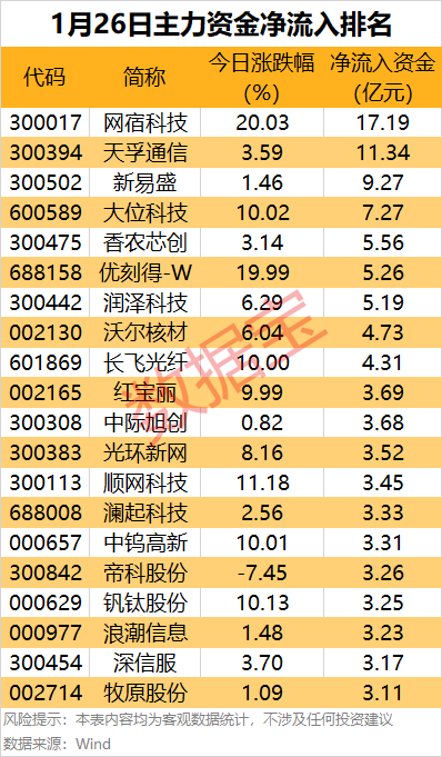 网宿科技和天孚通信主力资金净流入居前,均超11亿元。其中,IDC数据中心概念股网宿科技“20cm”涨停,龙虎榜数据显示,上榜营业部席位全天成交18.38亿元,占当日总成交金额比例为26.54%,合计净买入6.14亿元。具体来看,机构席位合计净买入2.18亿元。