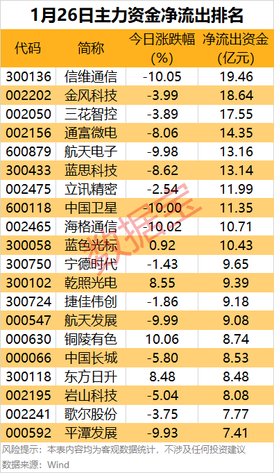 6G概念股信维通信主力资金净流出19.46亿元,居首,股价下跌10.05%。风电热门股金风科技主力资金净流出18.64亿元,居次席。