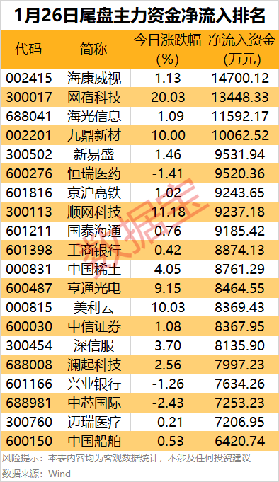 从个股来看,15股尾盘主力资金净流入金额均超8000万元,其中4股尾盘主力资金净流入均超1亿元。