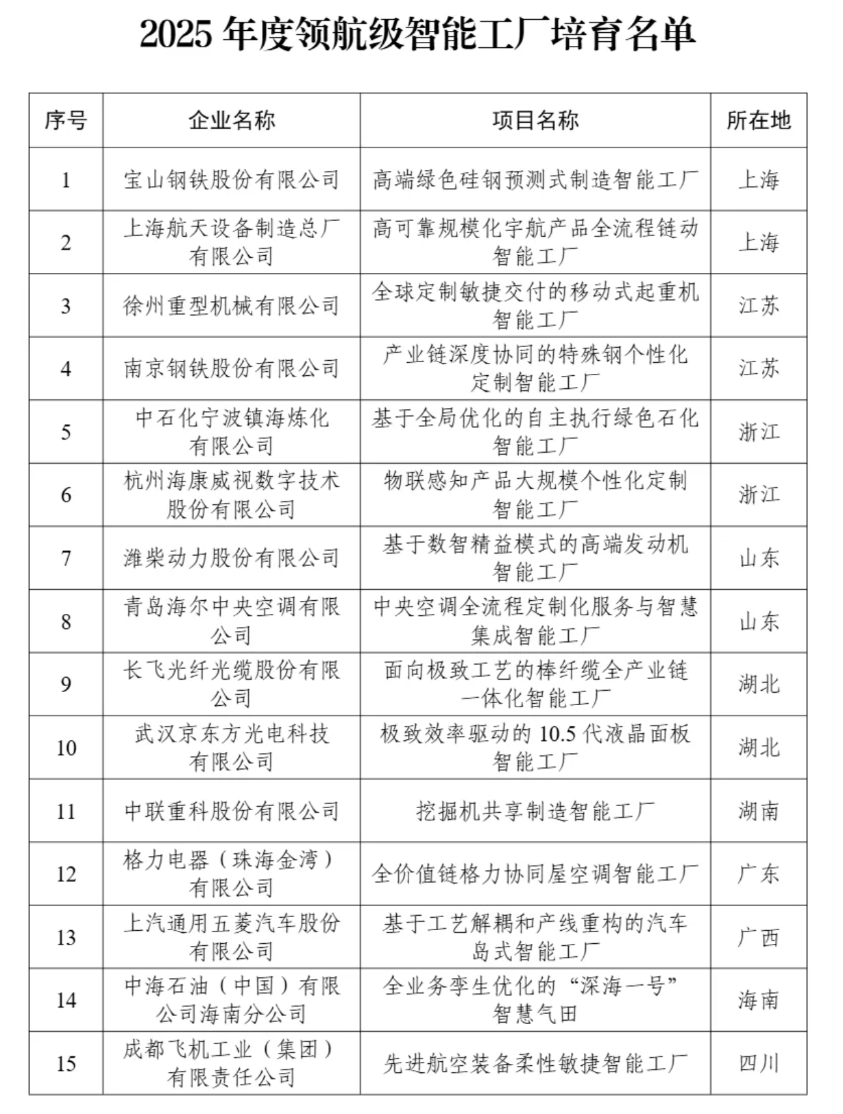 领航级智能工厂代表了我国制造业智能化的最高标准。首批公布的领航级智能工厂共15家,涵盖装备制造、原材料、电子信息、消费品等多个关键行业,中联重科、宝钢股份、海康威视等入选。
