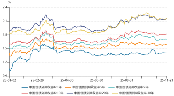 上周,利率债收益率弱势震荡。截至11月21日收盘,1Y、5Y、7Y国债分别报收1.40%、1.59%、1.70%,分别较前一周收盘变动0BP、1BP、1BP;10Y、20Y、30Y国债分别报收1.82%、2.16%、2.16%,分别较上周收盘变动1BP、1BP、2BP。