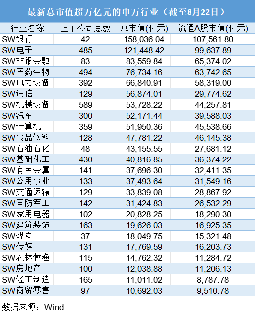 按申万一级行业,目前,总市值超万亿的行业有24个,涉及银行、电子、医药生物、食品饮料等。总市值最高的三大行业是银行、电子和非银金融,分别达到15.8万亿、12.14万亿和8.36万亿。紧随其后的,医药生物、电力设备、通信等行业总市值均超过5万亿元。