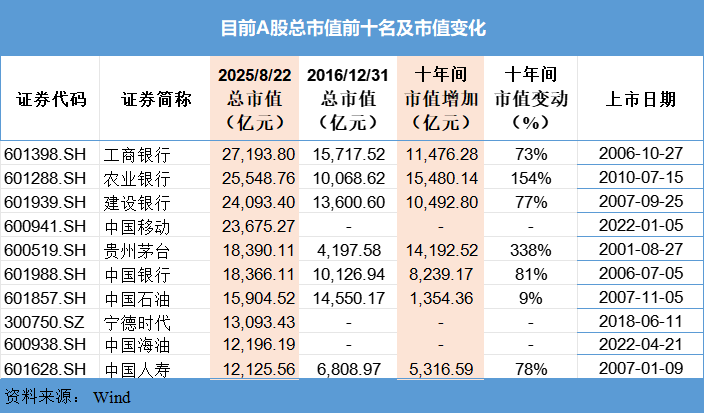 取而代之,经过十年发展,一批行业龙头公司跻身A股市值榜前列,还有一些近年上市的公司,一跃成为大市值龙头。