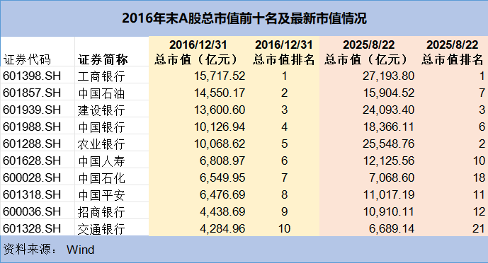 记者对比发现,与十年前的2016年末相比,A股总市值前三甲已全部被国有大行包揽,工商银行牢牢锁定“市值王”宝座。而一些昔日的大市值龙头,如今已掉队。相较十年前,中国石化交通银行如今已淡出市值榜前十队伍。