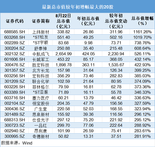 一些翻倍股、ST股,市值增长迅速。上纬新材最新总市值338.82亿元,较年初(26.86亿元)增幅高达1161%;*ST松发*ST宇顺最新总市值分别为551.4亿元、83.68亿元,较年初分别增长了1019%和738%。