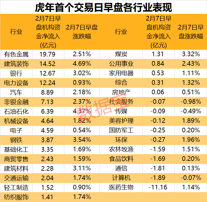 从机构资金来看,有色金属、建筑装饰、电力设备等4行业获机构资金净流入超10亿元。汽车、石油石化等获得超5亿元的净流入。另外,金融板块的银行、非银金融合计获得近20亿元的资金加仓,2大板块今日早盘涨幅均超过2%。