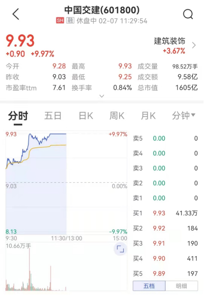 大基建央企板块再度爆发,中国交建涨停,中国电建、中国中冶、中国中铁等大涨。