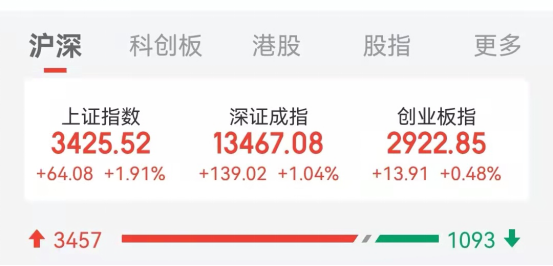 截至午间收盘,上证指数上涨1.91%,深证成指上涨1.04%,创业板指上涨0.48%。