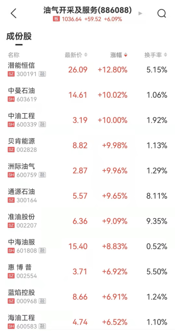 春节期间国际油价大涨,带动A股石油概念股集体走强。其中,中曼石油、中油工程、贝肯能源、洲际油气等涨停,中国石油涨超8%,中国石化、宝丰能源涨超3%。