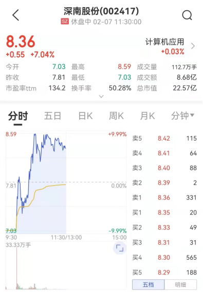 深南股份盘中一度上演“地天板”,该股跌停开盘后盘中拉升涨停,此前上演三连板。截至午间收盘,深南股份报8.36元/股,上涨7.04%,换手率高达50.28%。