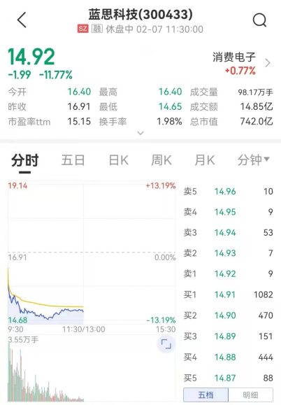 几家欢喜几家忧,一批业绩爆雷股也在今日上午大幅下跌。正邦科技、鹏博士、太安堂、江河集团等业绩爆雷股跌停,蓝思科技放量跌近12%,立讯精密、歌尔股份等跟随下滑。