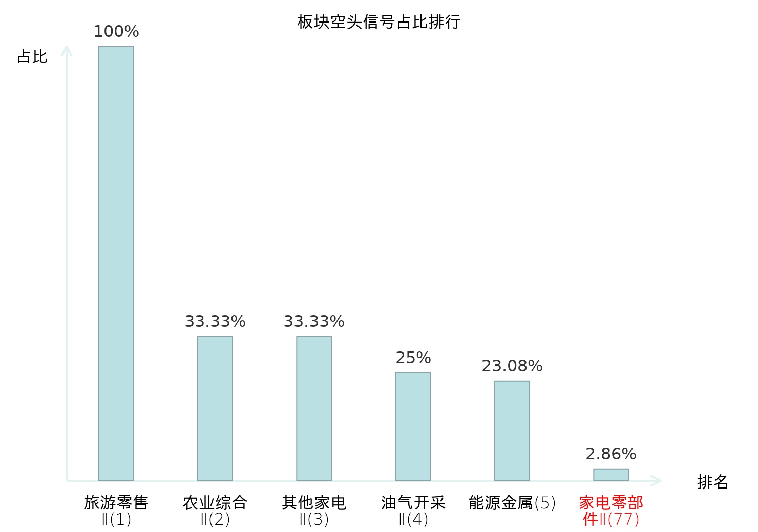 全市场所有行业板块中主力空头信号占比排名中,旅游零售Ⅱ板块位居第一。影视院线板块名次提升最快,较昨日上升105位。