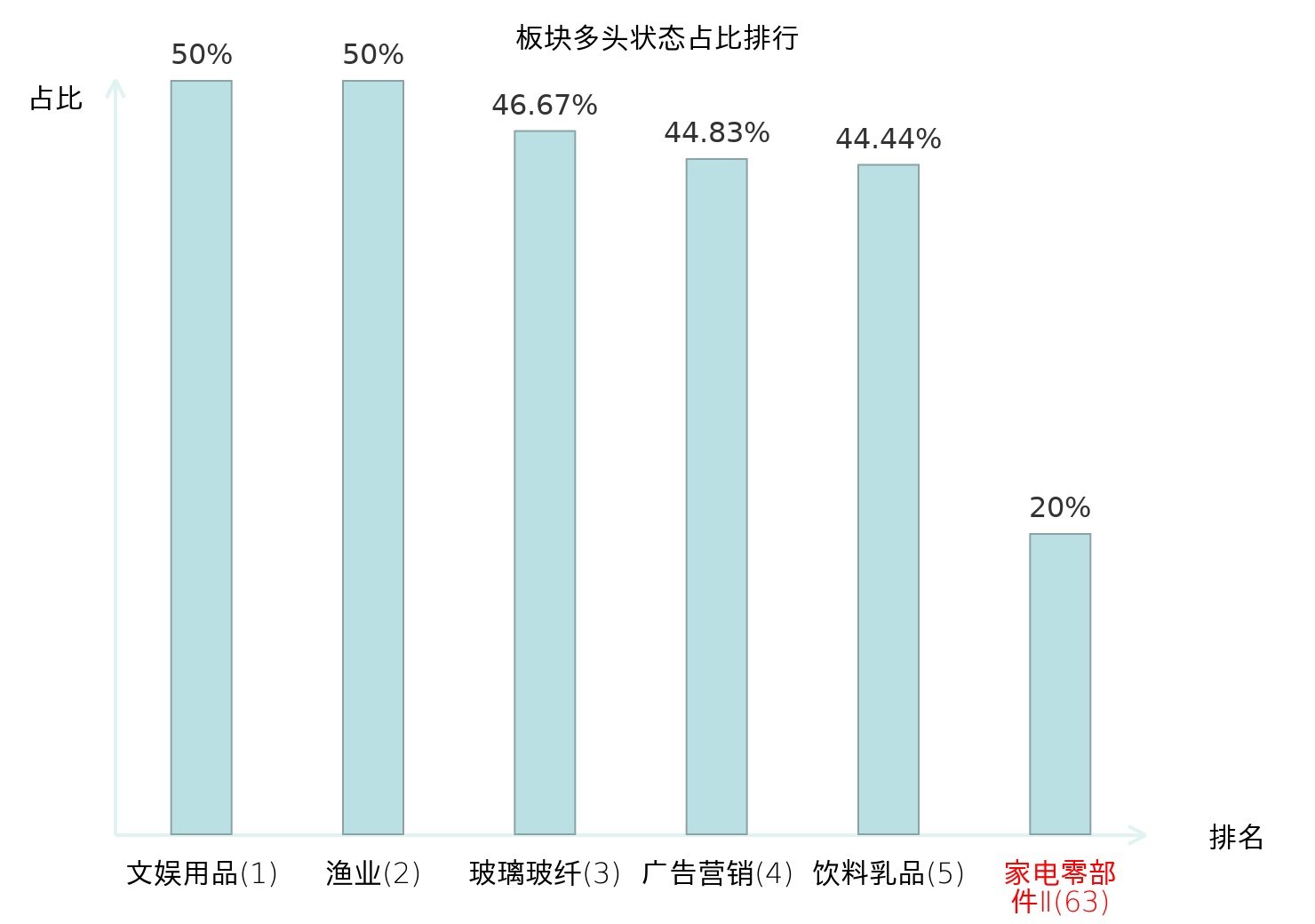 全市场所有行业板块中主力多头状态占比排名中,文娱用品板块位居第一。饮料乳品板块名次提升最快,较昨日上升59位。