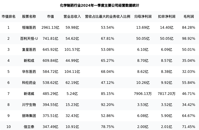 科伦药业最新报告期数据为一季度,下表汇总了化学制药行业内市值靠前的公司一季度主要经营数据
