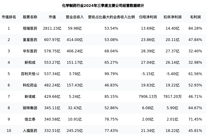 科伦药业最新报告期数据为三季度,下表汇总了化学制药行业内市值靠前的公司三季度主要经营数据