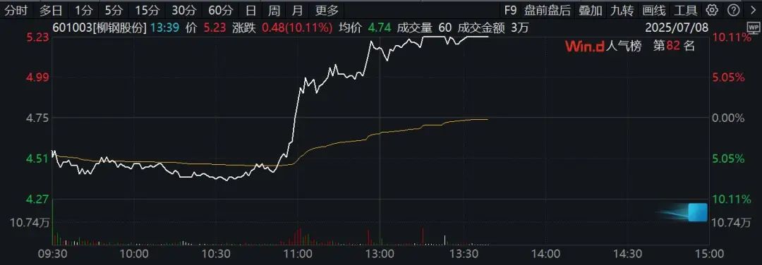 钢铁板块今日走强,柳钢股份午后一度封涨停,走出6天5板,此前金岭矿业涨停,太钢不锈、重庆钢铁、盛德鑫泰、华菱钢铁、三钢闽光等跟涨。