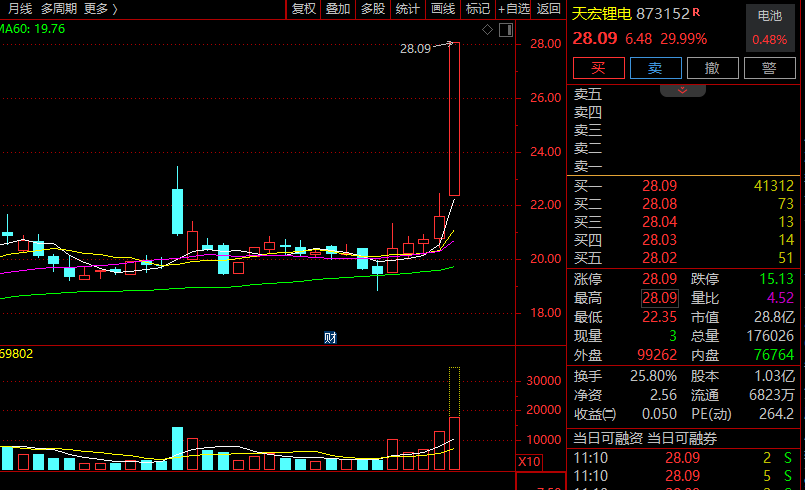 锂电产业链也全线大幅拉升,固态电池、动力电池回收、储能、锂矿等细分板块纷纷逆市上扬。天宏锂电、力佳科技双双30%涨停,天际股份、金龙羽、键邦股份、胜利精密等逾10股涨停或涨超10%。