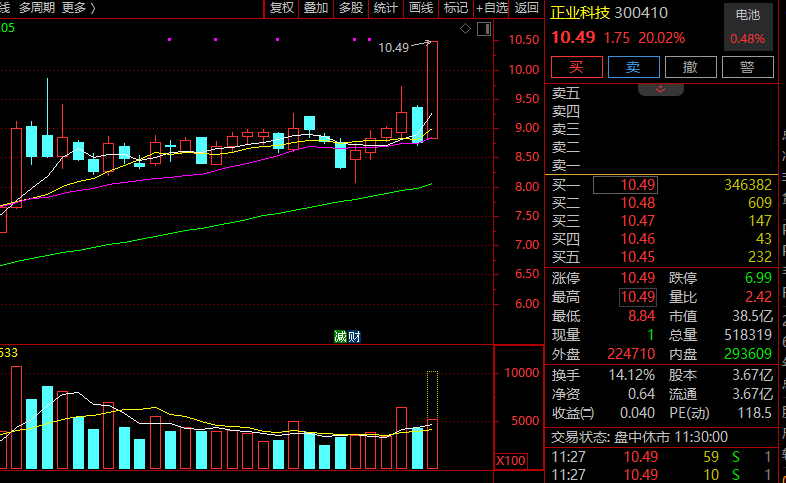 BC电池、HJT电池、光热发电、TOPCon电池等光伏产业细分板块也纷纷逆市走强,正业科技开盘仅4分钟直线20%涨停,通润装备、天通股份等多股以涨停开盘。