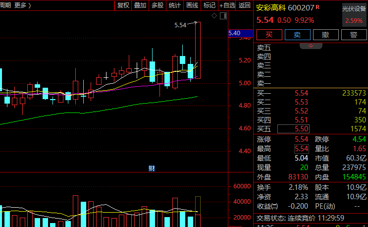 新能源概念股早间集体走强,光伏设备领涨,板块指数盘初一度直线拉升逾5%,创年内新高,半日成交接近昨日全天成交。安彩高科(600207)平开后垂直拉升,仅约3分钟就封死涨停,上能电气、大全能源等盘中也异动拉升。