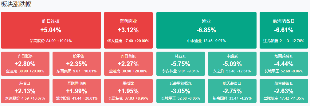 板块方面,医药、零售、CPO等板块涨幅居前,军工装备、林业、游戏等板块跌幅居前。截至收盘,沪指跌0.15%,深成指涨1.02%,创业板指涨2.14%。