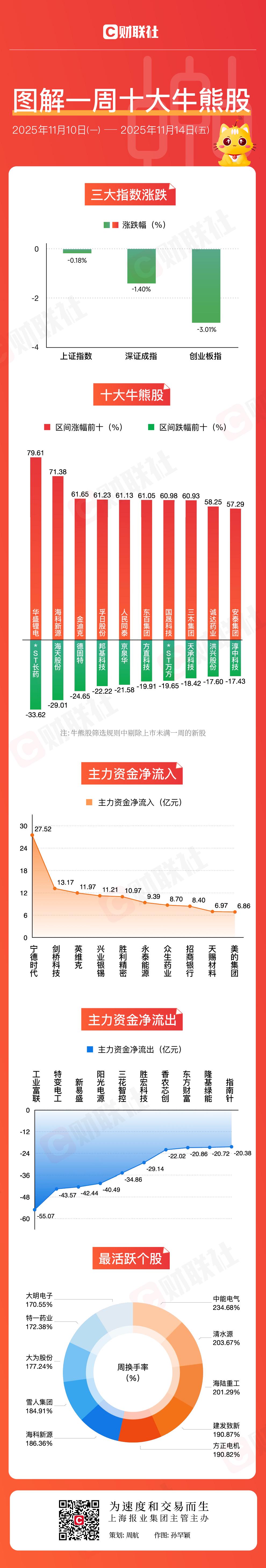 财联社11月16日讯,本周A股三大指数震荡回调,其中上证指数周跌0.18%,深成指周跌1.40%,创业板指周跌3.01%。本周医药商业、电池板块涨幅居前,小金属、锂电池、氟化工概念股表现活跃。