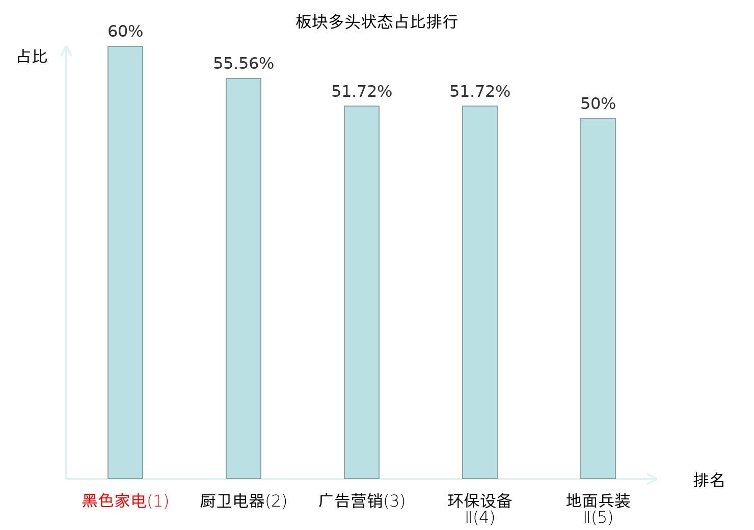 全市场所有行业板块中主力多头状态占比排名中,黑色家电板块位居第一。保险Ⅱ板块名次提升最快,较昨日上升118位。