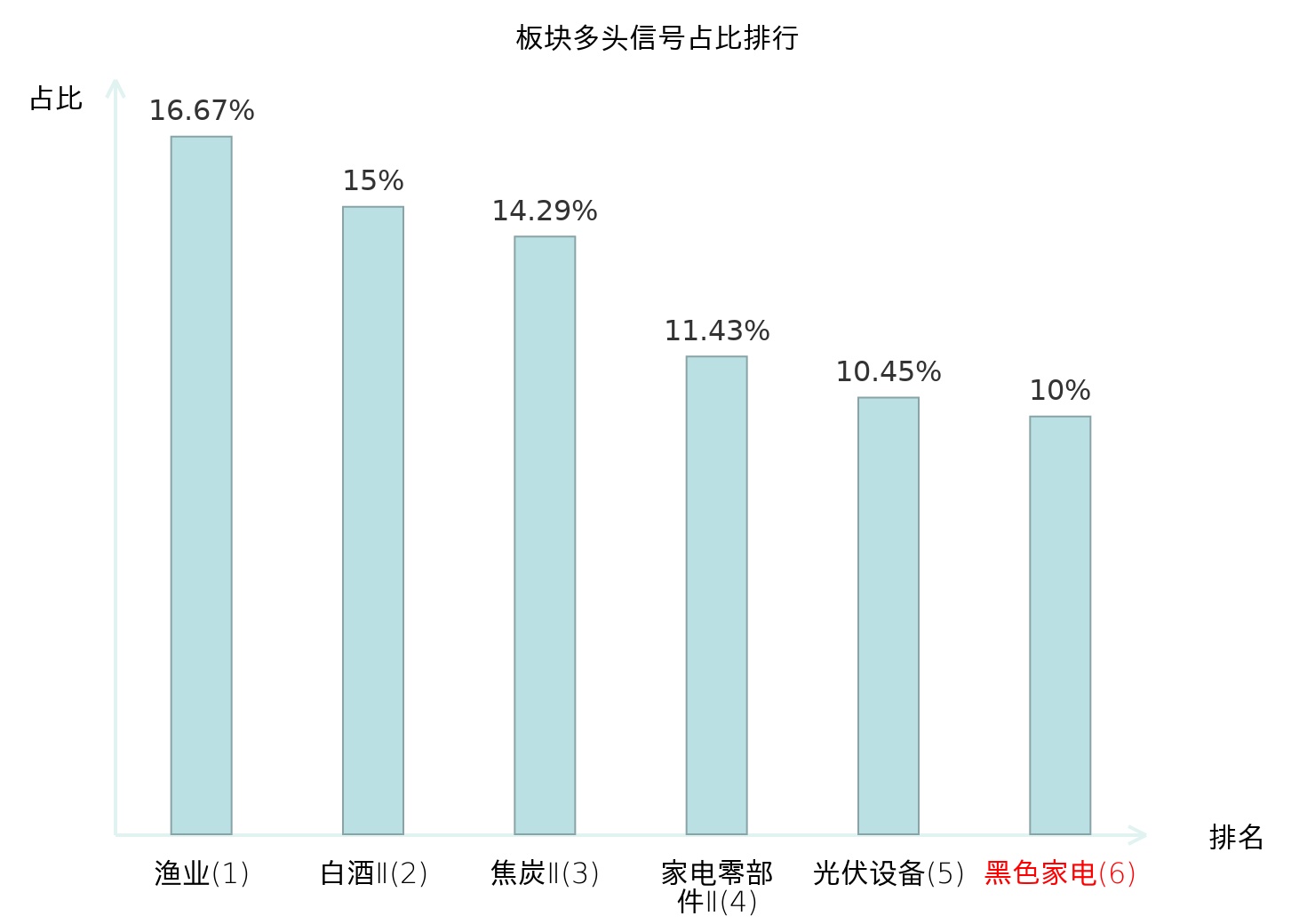 全市场所有行业板块中主力多头信号占比排名中,渔业板块位居第一。黑色家电板块名次提升最快,较昨日上升111位。