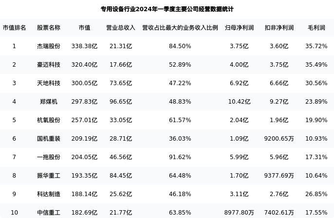 杭氧股份最新报告期数据为一季度,下表汇总了专用设备行业内市值靠前的公司一季度主要经营数据