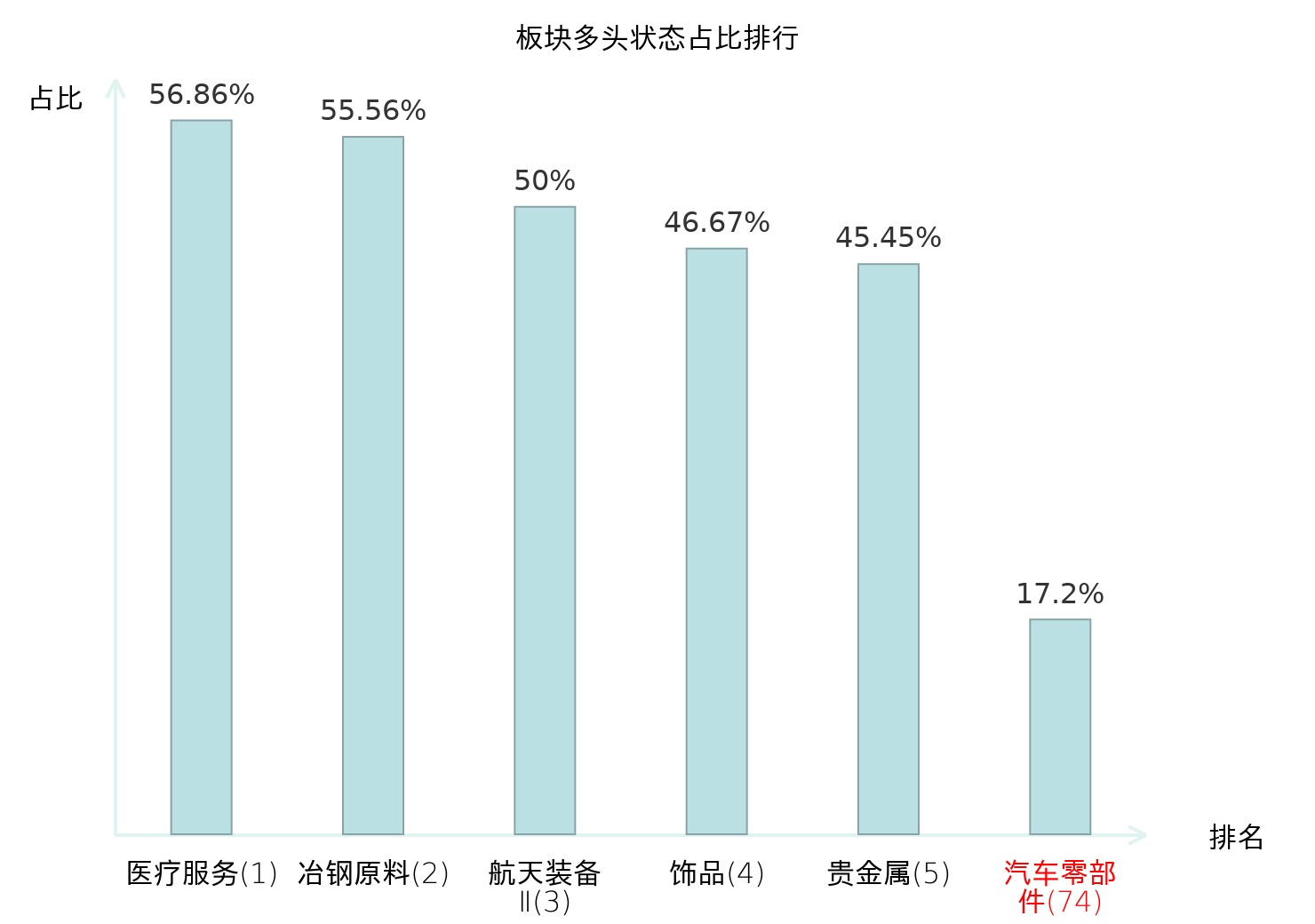 全市场所有行业板块中主力多头状态占比排名中,医疗服务板块位居第一。旅游及景区板块名次提升最快,较昨日上升61位。