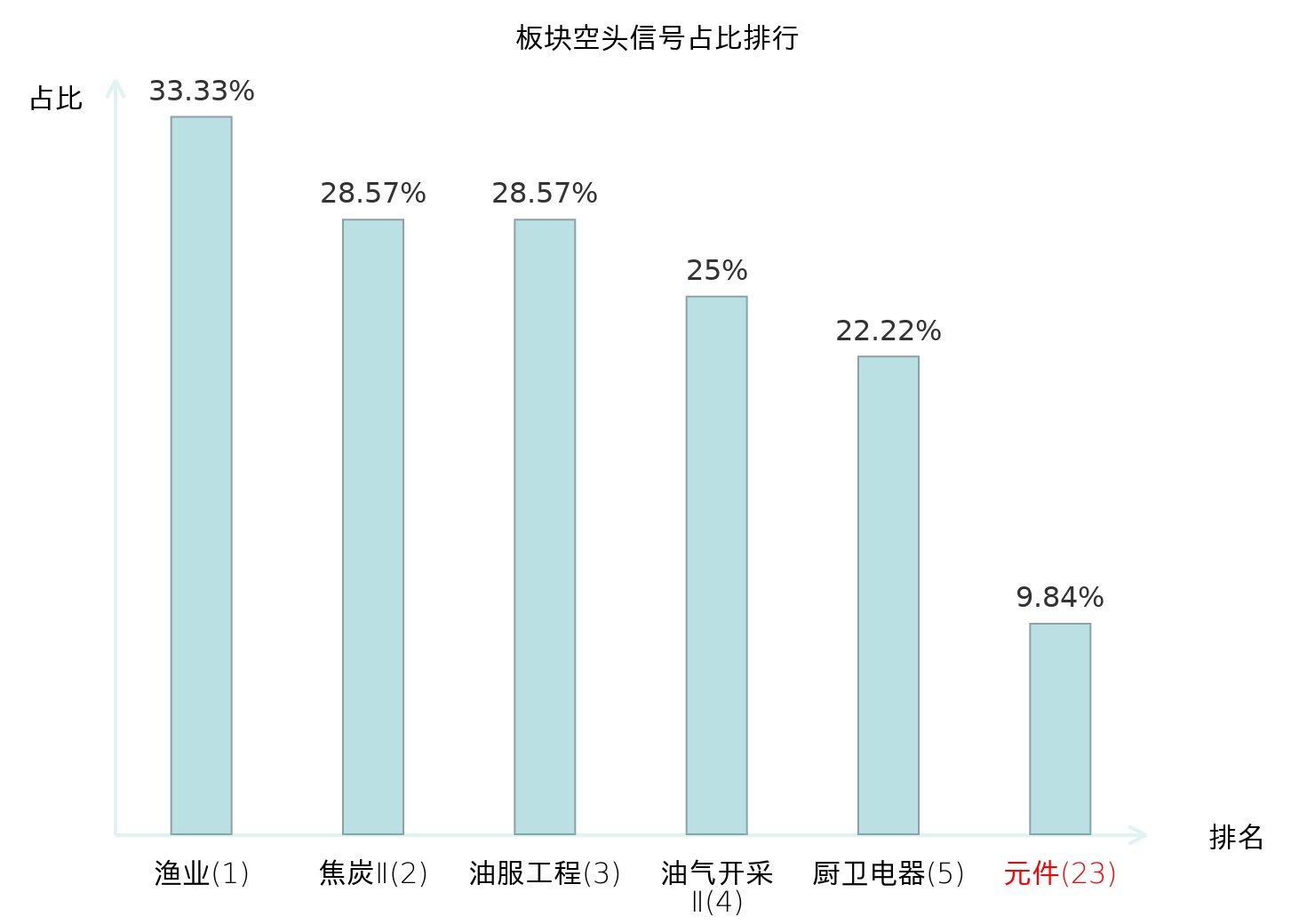 全市场所有行业板块中主力空头信号占比排名中,渔业板块位居第一。农产品加工板块名次提升最快,较昨日上升112位。