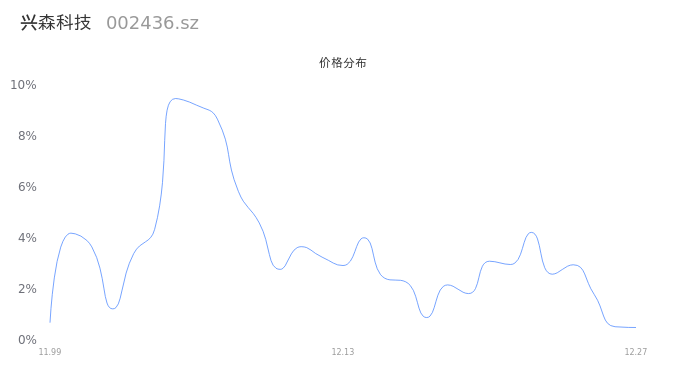 然后我们来看下当日成交的价格分布。将今天股票的最低价与最高价之差形成的价格区间进行切片,并画直方图进行分析,观察成交量在价格区间的分布情况。可以发现,当日的成交分布呈现左偏峰分布,这说明,该股票大部分成交集中在中位数以下,说明交易重心下降,近期可能会存在短线下跌风险。