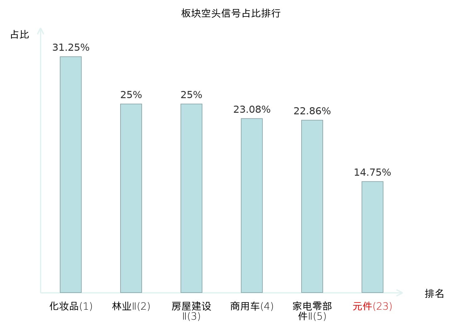 全市场所有行业板块中主力空头信号占比排名中,化妆品板块位居第一。房屋建设Ⅱ板块名次提升最快,较昨日上升113位。