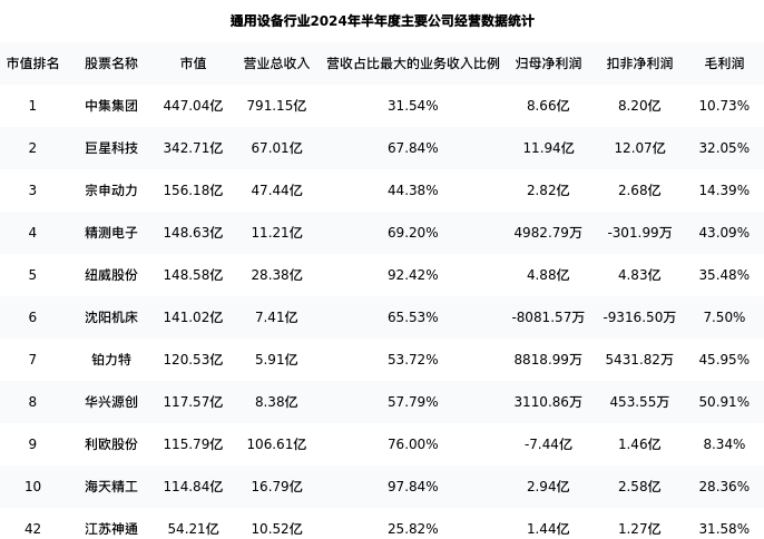江苏神通最新报告期数据为半年度,下表汇总了通用设备行业内市值靠前的公司半年度主要经营数据
